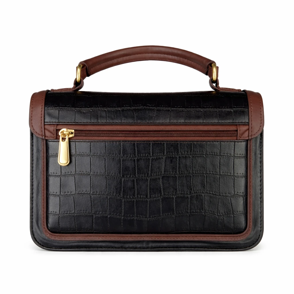 Bolsa Feminina Elegante Croco Preto com Detalhes Marrons e Fecho Dourado