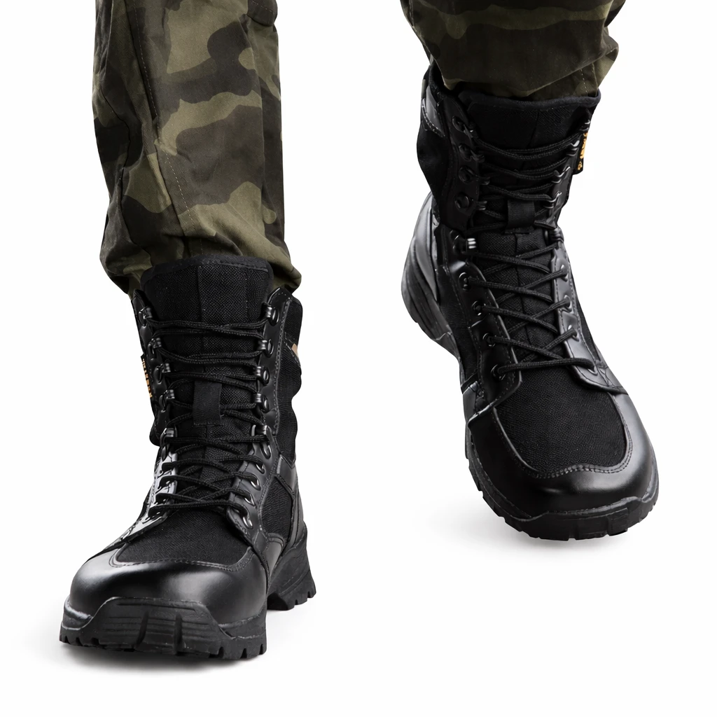 Fabricadas com couro liso de alta qualidade, garantem durabilidade e um visual moderno estilo militar. O interior com forro respirável mantém os pés secos e confortáveis mesmo após longas horas de uso.