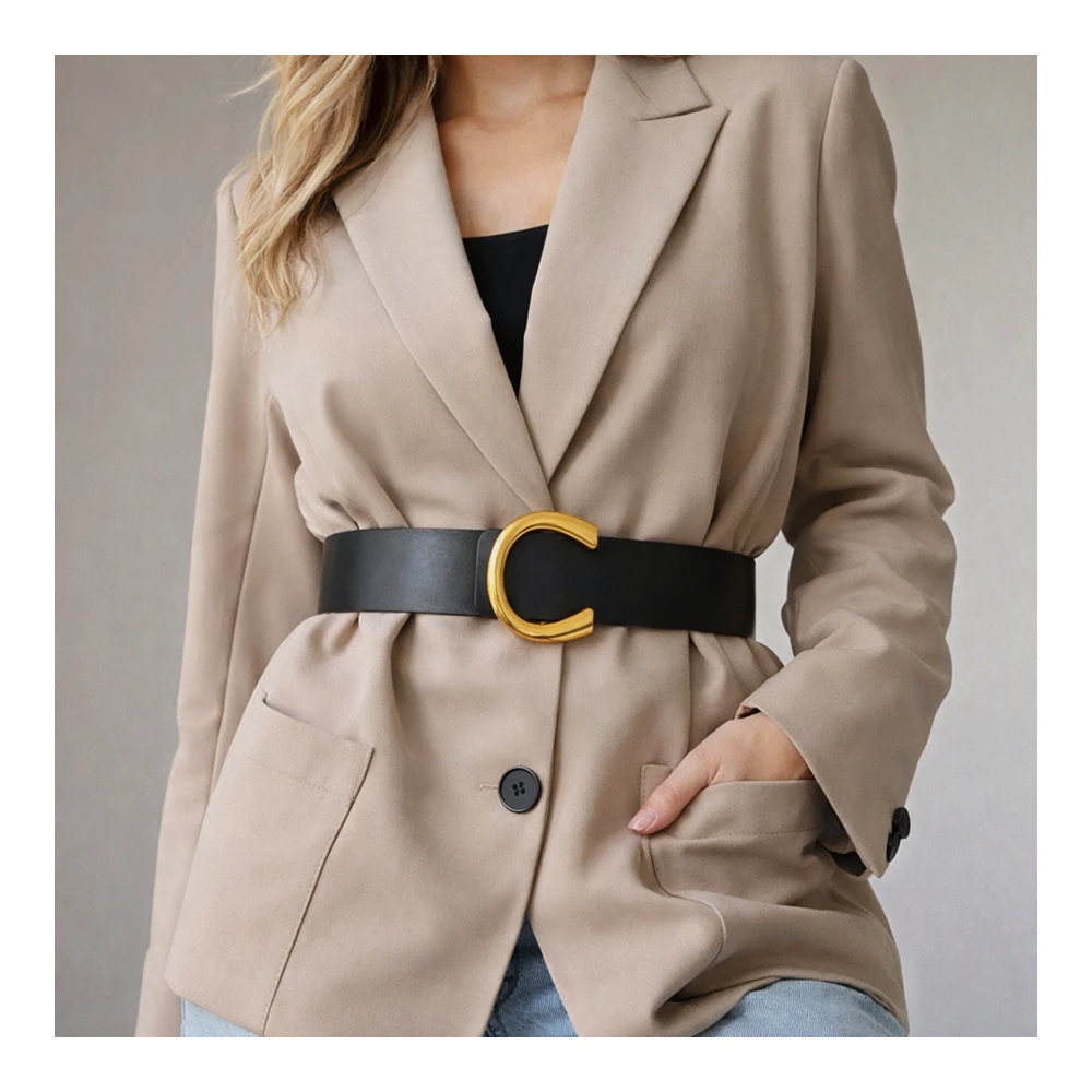 Adicione um toque de sofisticação ao seu visual com este elegante cinto feminino, ideal para destacar qualquer look com estilo e personalidade. Produzido com material de alta qualidade e acabamento premium, este cinto apresenta uma fivela dourada em formato moderno que traz charme e exclusividade à peça.
