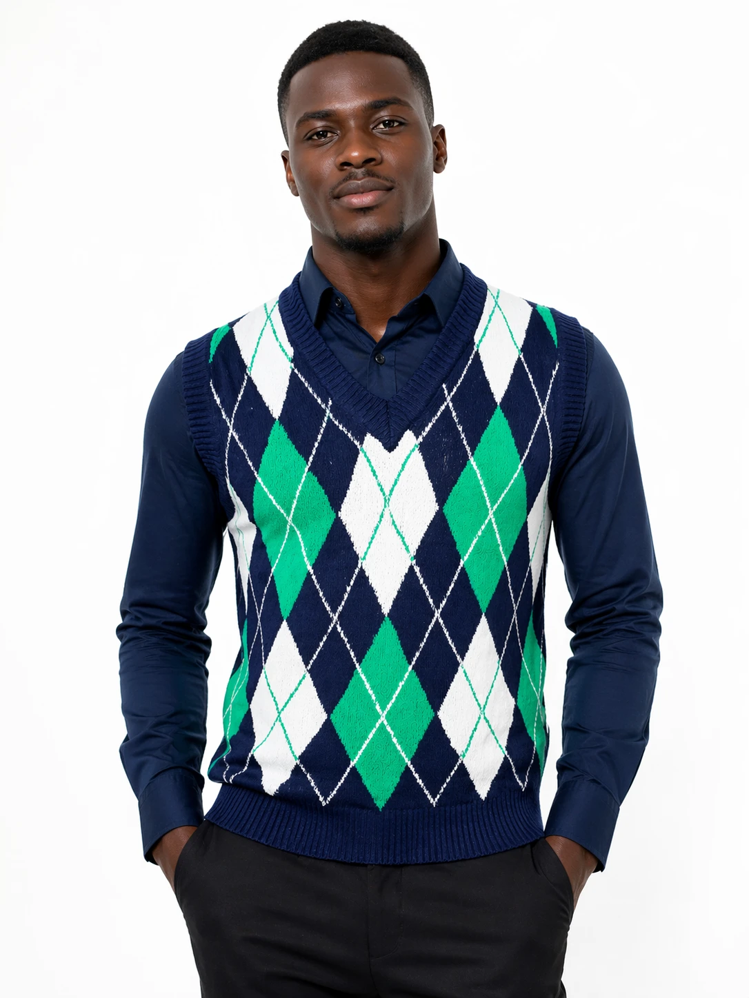 Eleve o seu estilo com este elegante colete masculino em malha, com design clássico argyle. Produzido em tecido confortável e leve, apresenta uma combinação sofisticada de azul marinho, branco e verde, ideal para ocasiões formais ou looks casuais refinados.
