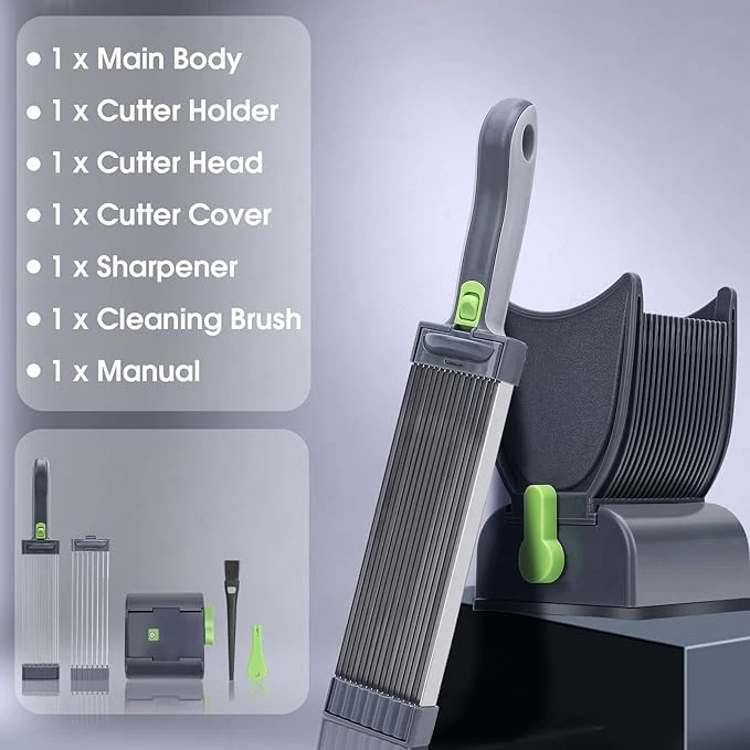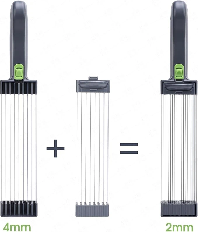 Fabricado com materiais resistentes e de alta qualidade, o fatiador possui lâminas múltiplas afiadas que permitem cortar vários pedaços ao mesmo tempo, economizando tempo no preparo das refeições.