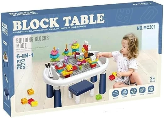 A mesa multifuncional permite diferentes atividades: construção com blocos, desenho, jogos e muito mais. Inclui 49 peças de blocos de construção, estimulando a imaginação e a coordenação motora da criança.