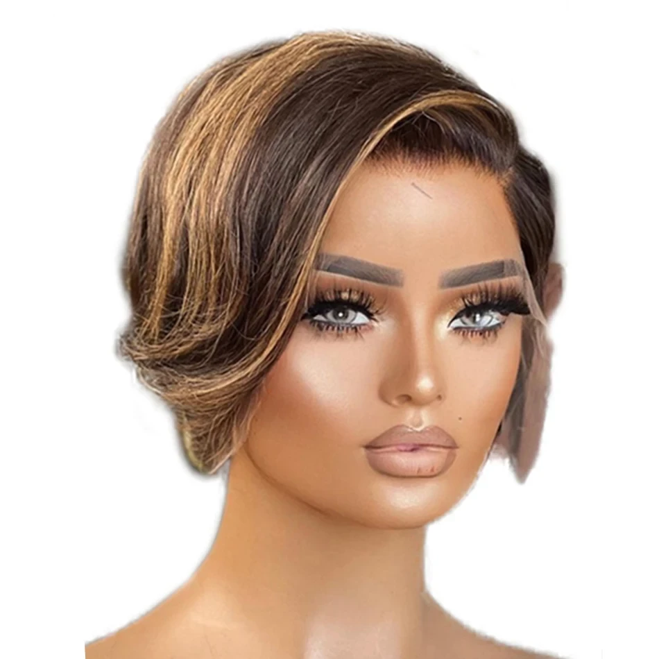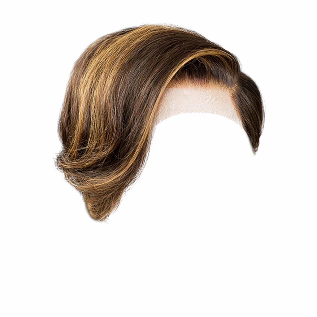 O modelo apresenta um corte curto com volume equilibrado e mechas iluminadas que criam um efeito moderno e elegante. Ideal para diferentes ocasiões, desde o uso diário até eventos especiais, permitindo renovar o visual com praticidade.