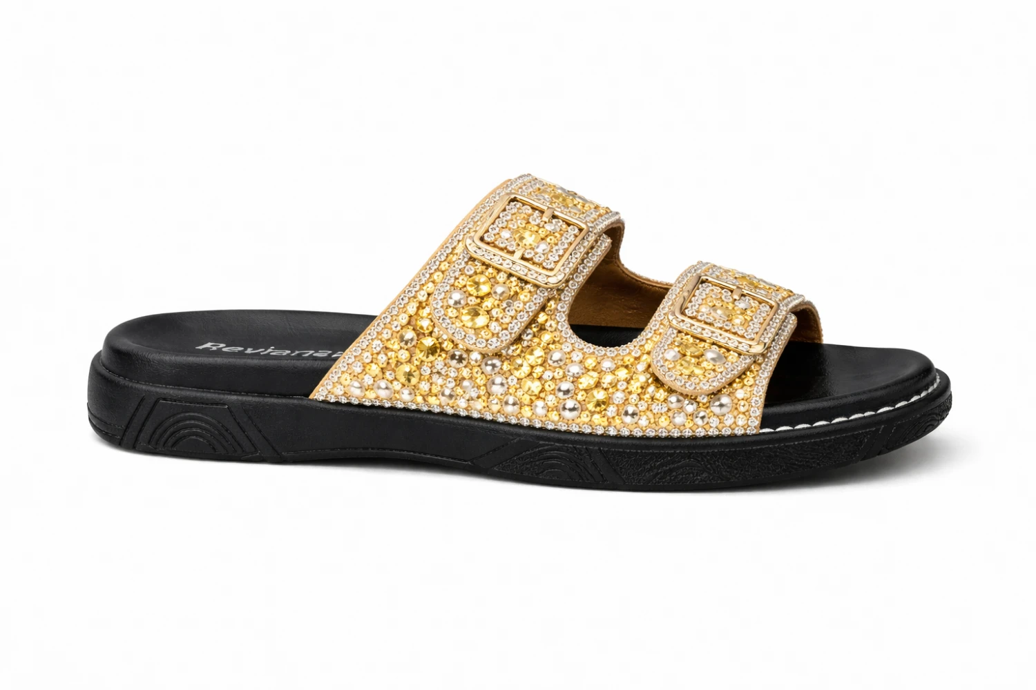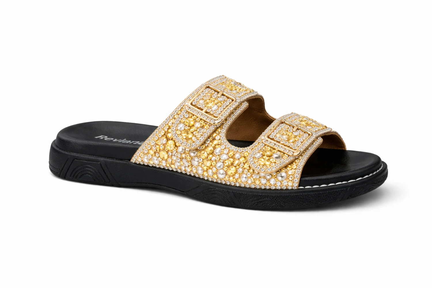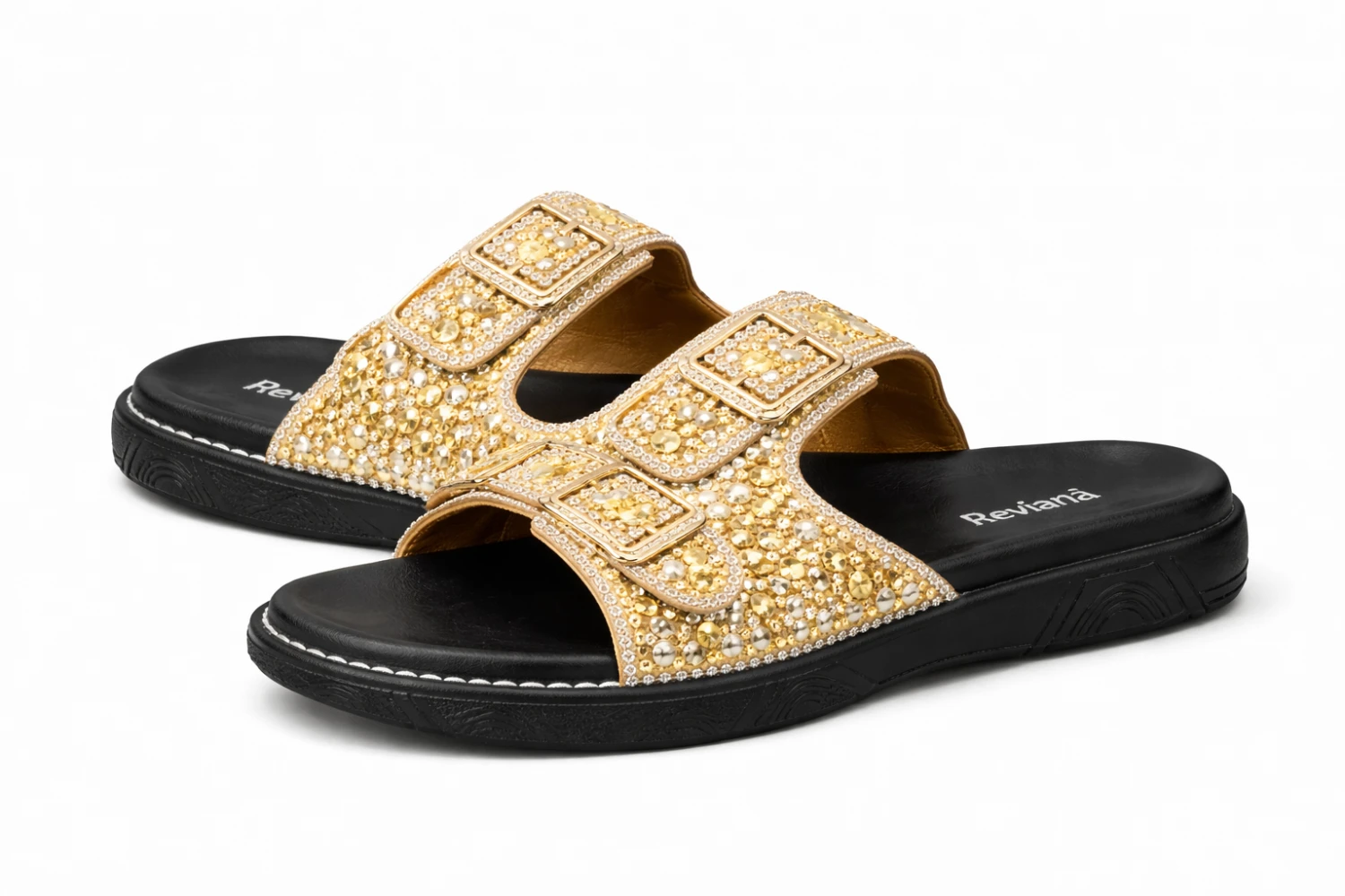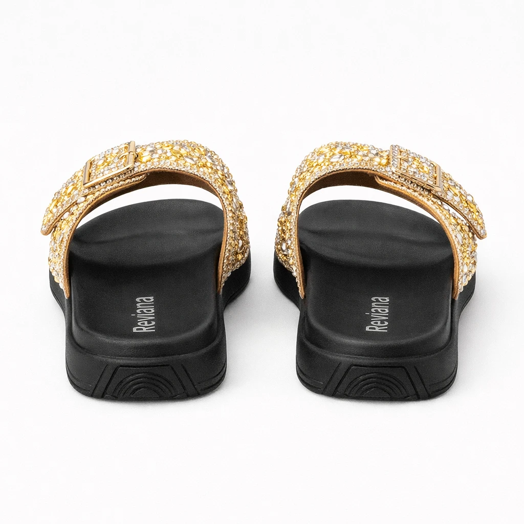 om desigCn moderno tipo slide e detalhes em pedrarias douradas, ela transforma qualquer look simples em algo sofisticado. As duas tiras com fivelas decorativas garantem um acabamento elegante e cheio de personalidade.