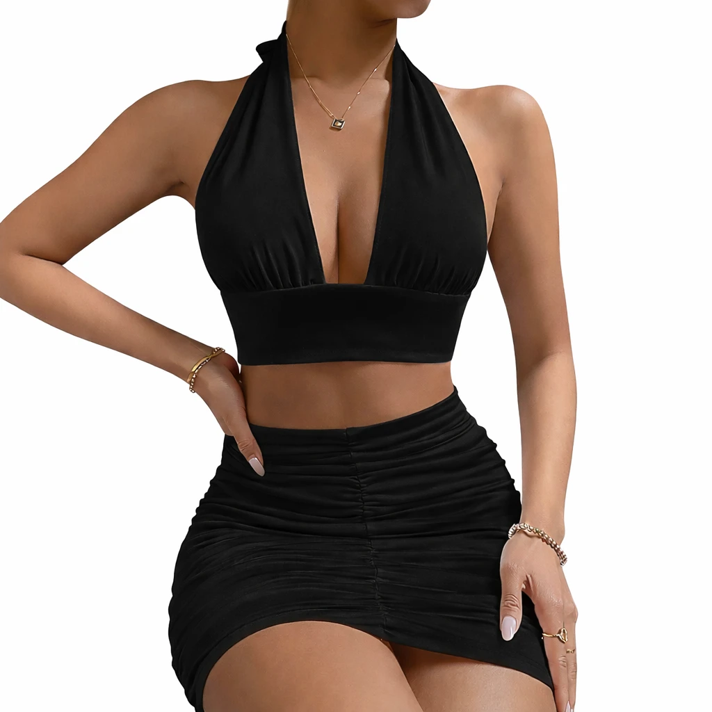 Realce a sua elegância com este conjunto feminino moderno e sofisticado, composto por um top estilo halter com decote profundo e uma saia justa franzida que valoriza as curvas.