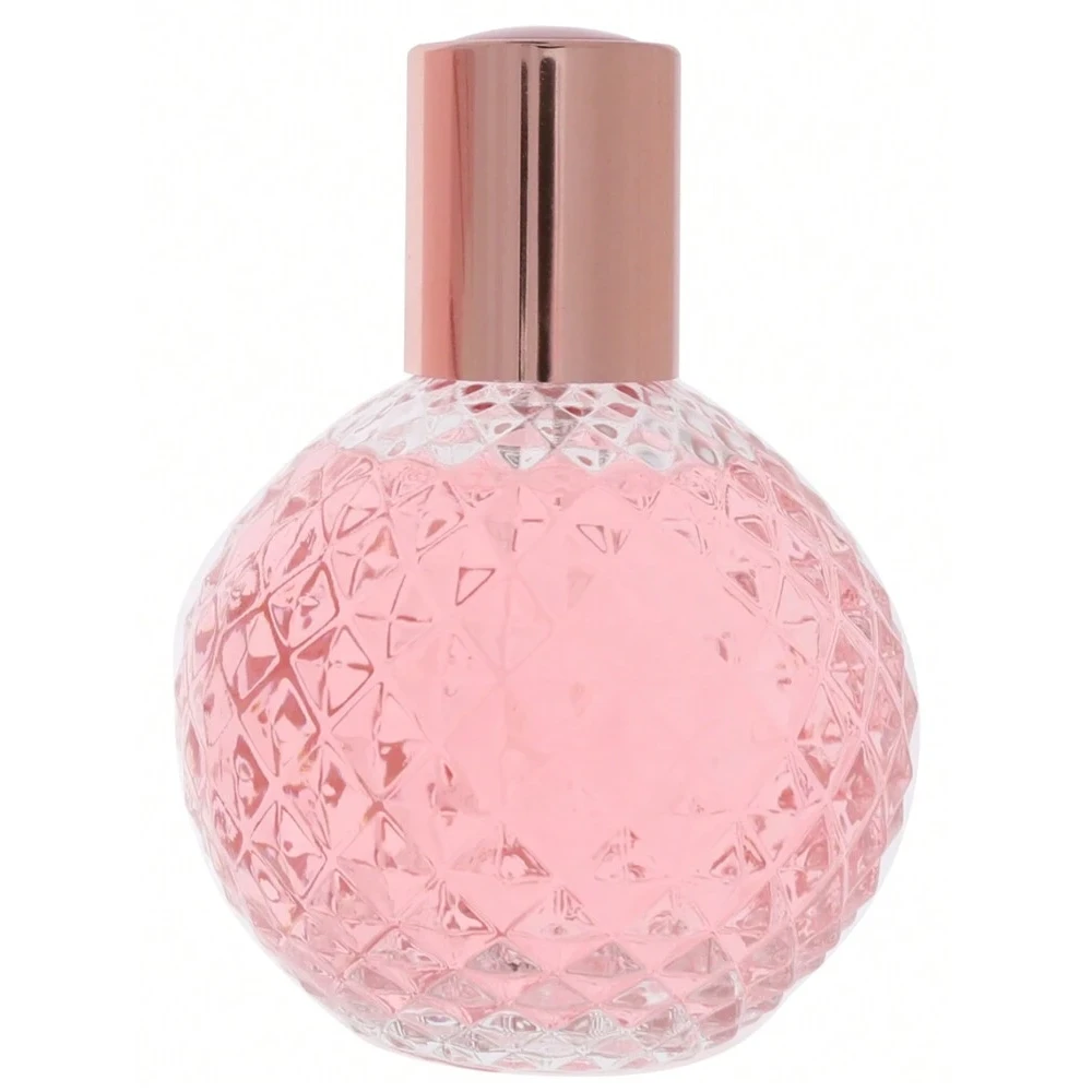 O frasco, em tom rosa com acabamento lapidado estilo diamante, transmite luxo e delicadeza, tornando-o também uma excelente opção para presente.