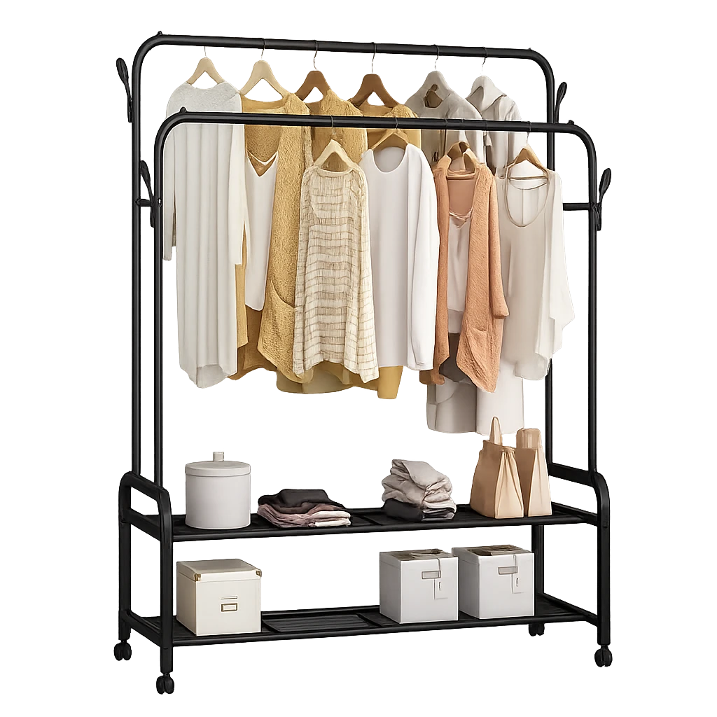 Fabricado em aço inoxidável de alta qualidade, garante durabilidade e estabilidade mesmo com peças mais pesadas, como casacos e cobertores. A prateleira inferior reforçada é perfeita para guardar sapatos, caixas, bolsas ou outros acessórios, tornando-o um verdadeiro organizador multifuncional.